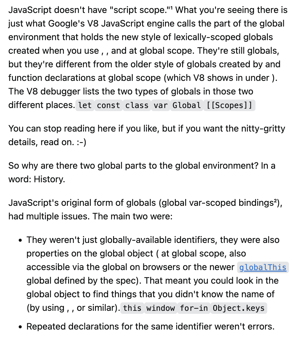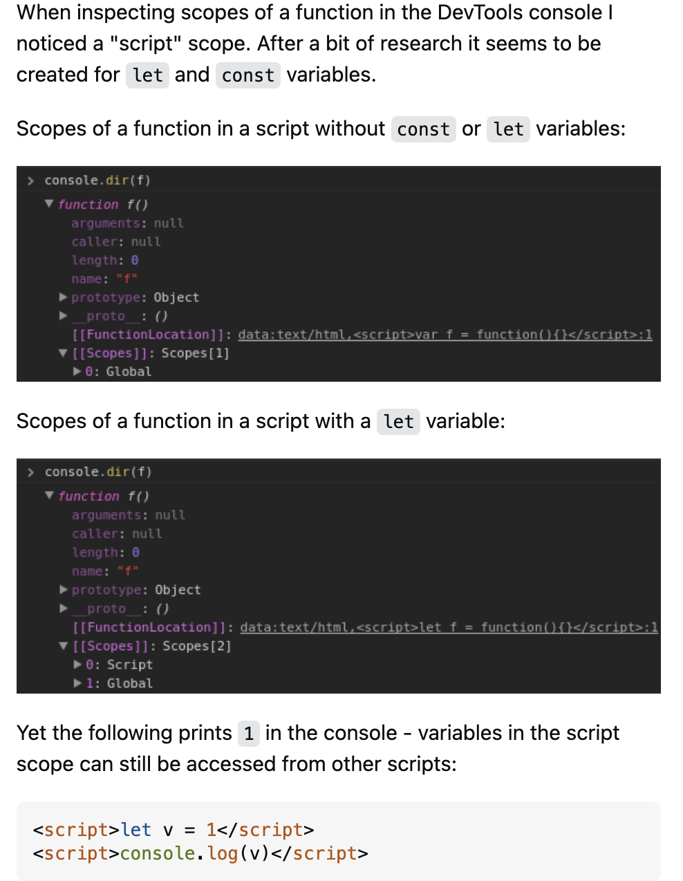 - script Scope : Google's V8 JavaScript engine calls the part of the global environment that holds the new style of lexically-scoped globals created when you use , , and at global scope